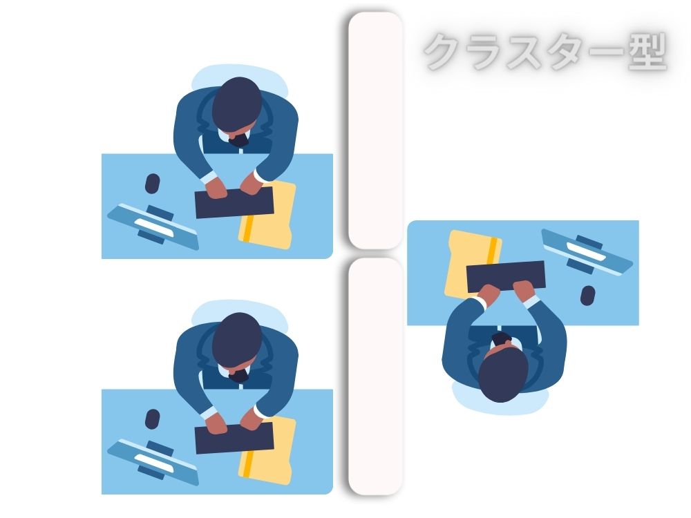 左右・前後隣り合うスタッフにはコニュニケーションが取りやすく、プライバシーが確保できますが、限られたオフィススペースであることを踏まえると、効率が悪いです。