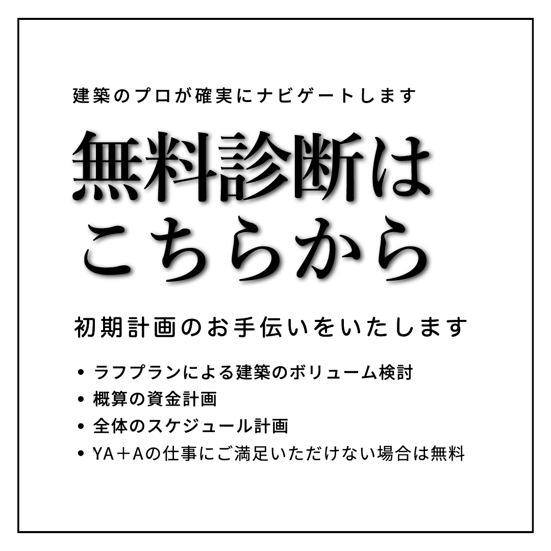 YA+Aに1時間程度いただければ、お客様のご要望、課題、疑問等を『無料診断』して建築を進めていく上で必要な『建築プラン』をお作りさせていただきます。