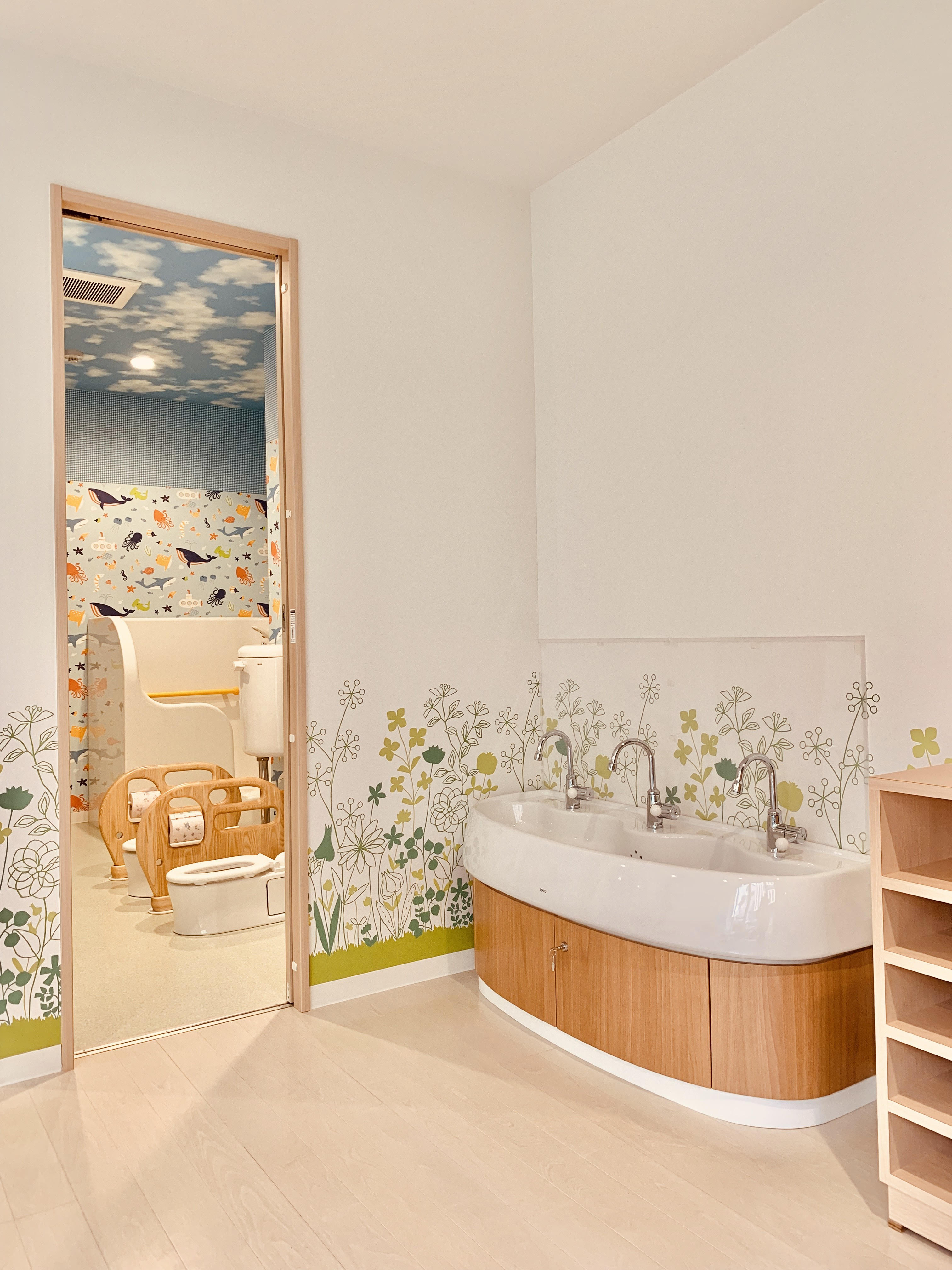手を洗う場所や教室は野原のような壁紙を主に用いていますが、こちらはあえて、空と海の魚たちの壁紙を使用し、差別化を図っています。