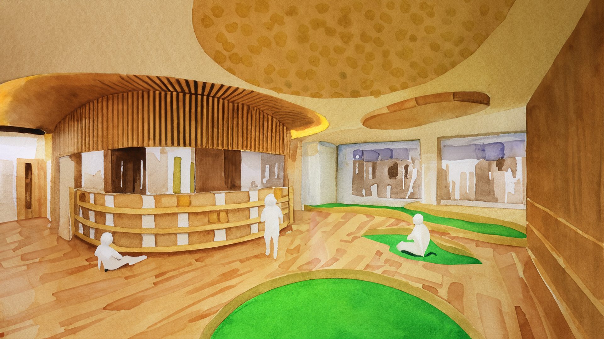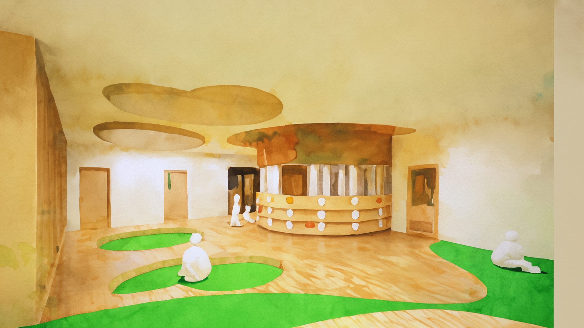 中国青海省西寧市に新たに計画されている小規模保育施設です。自然素材と温かみのあるデザインを基調とし、木のぬくもりや曲線を活かした内装が特徴です。子どもたちが安心して過ごせるよう、柔らかな色合いと開放感のある空間づくりにこだわりました。床面にはグリーンのカーペットエリアを設け、自由な遊びやリラックスができる環境を整備。円形の天井や曲線の壁面は、子どもの感性を育み、創造力を刺激する設計となっています。