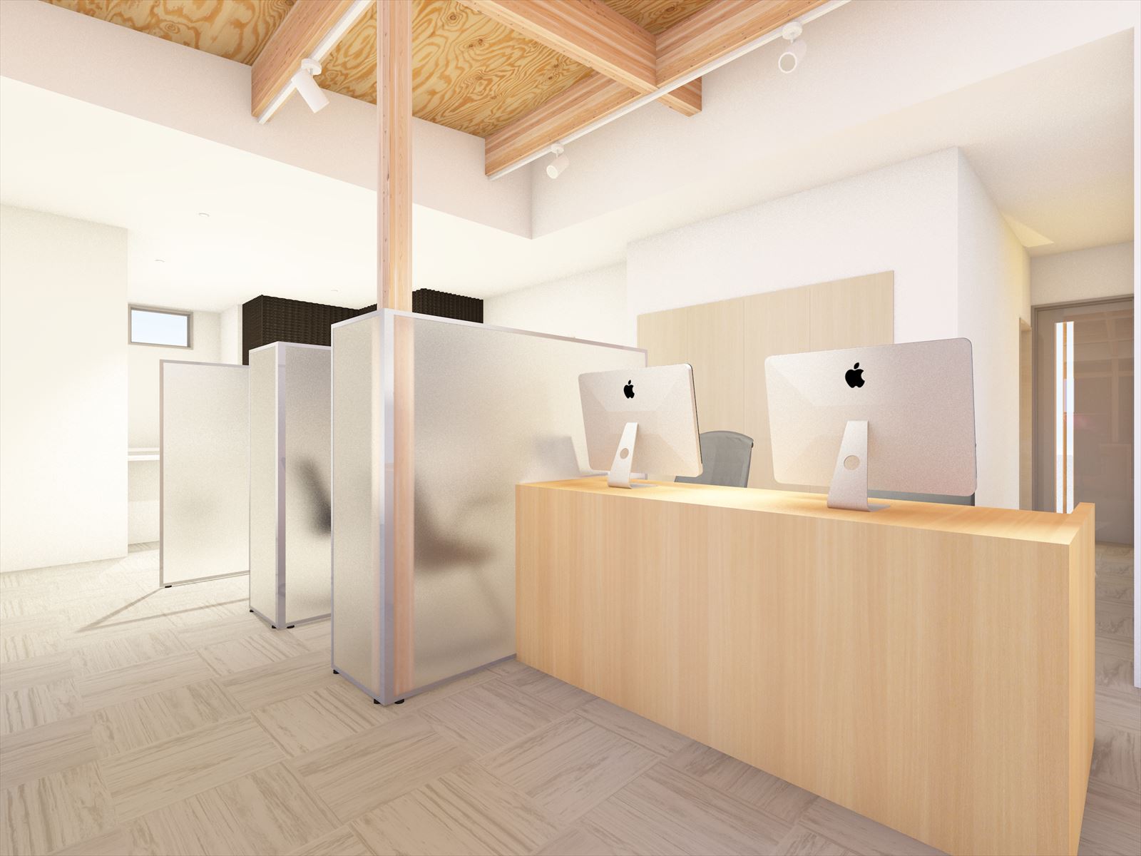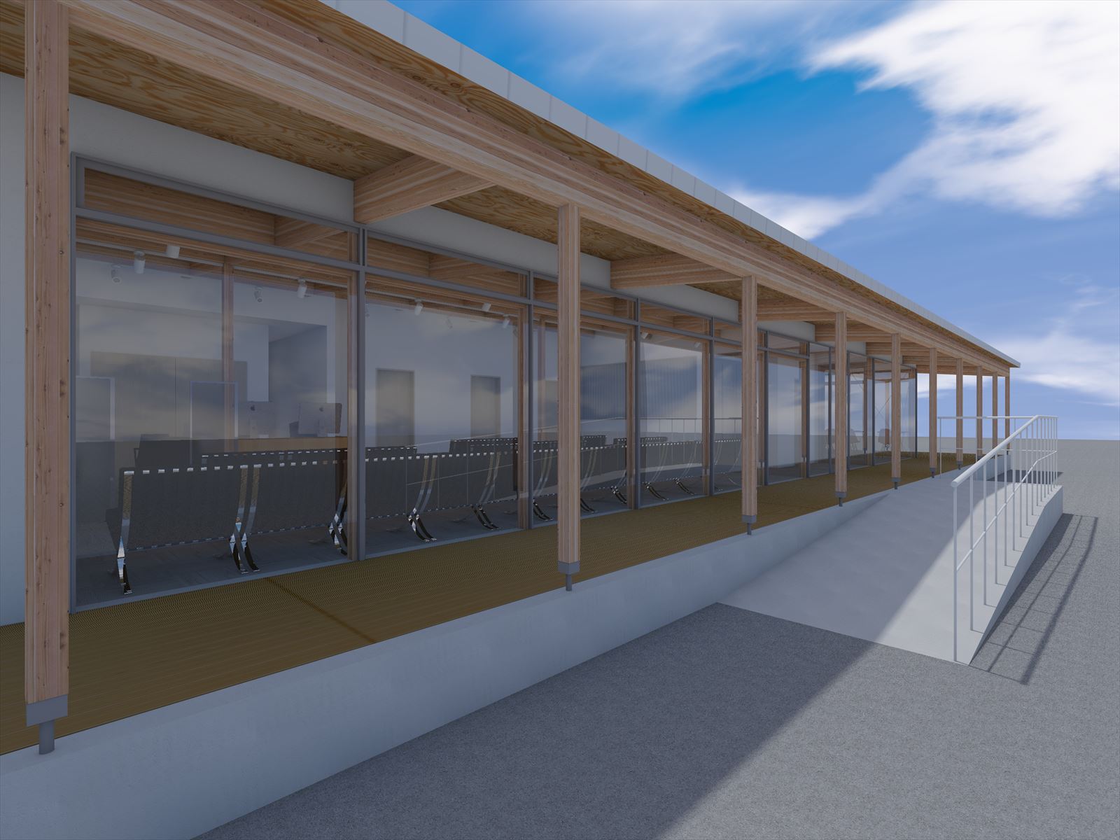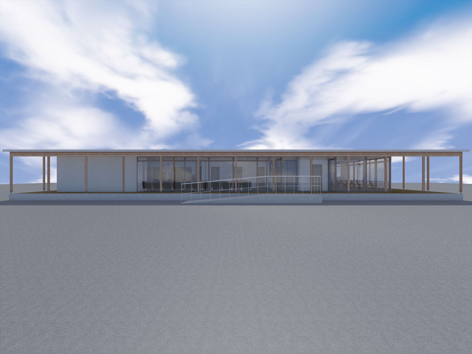 木造のフレームのリズミカルな木軸と格子のデザインのクリニック