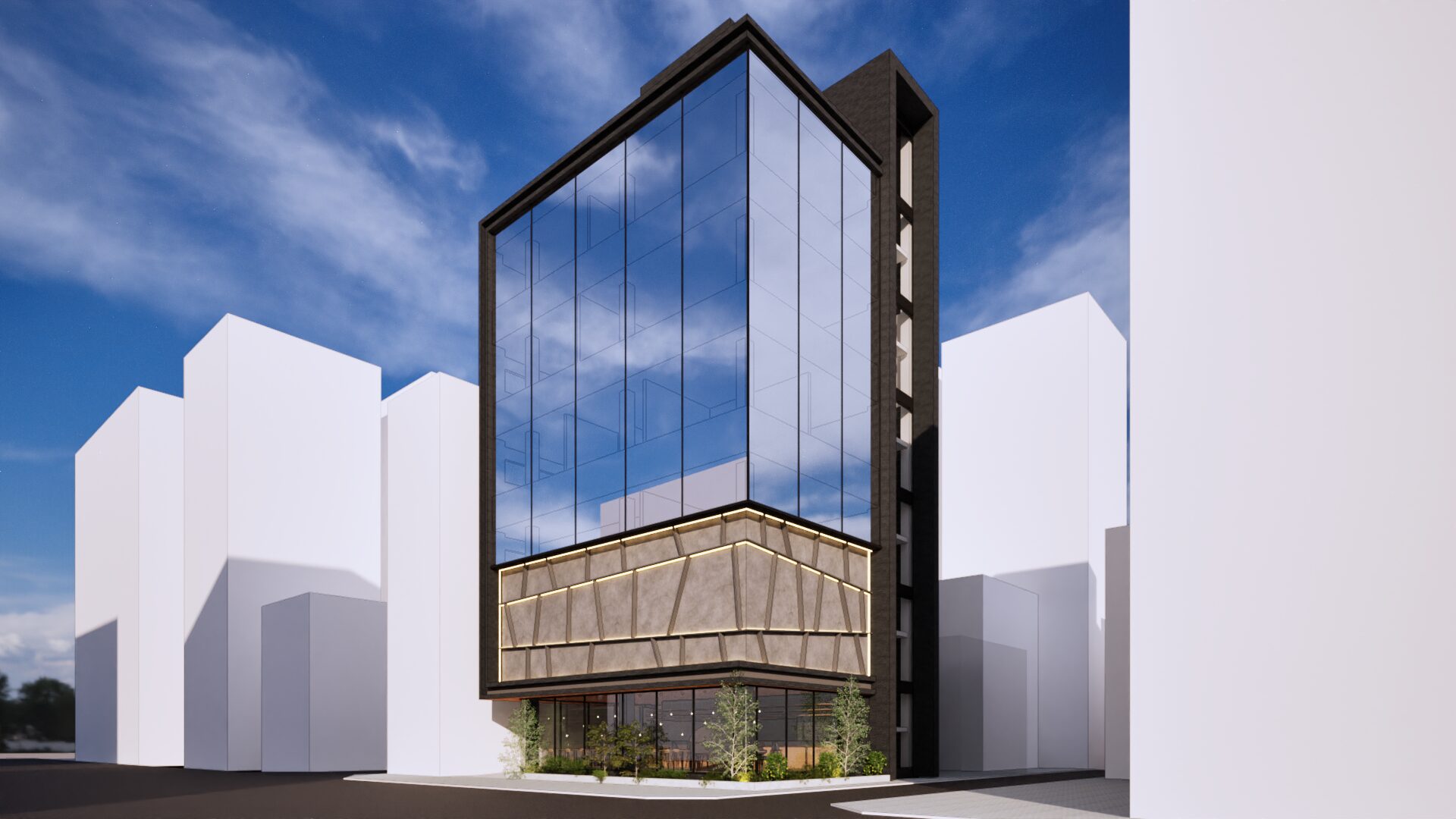 東京都台東区に計画する本建物は、クリニック、カフェ、テナントスペースから構成される複合施設である。