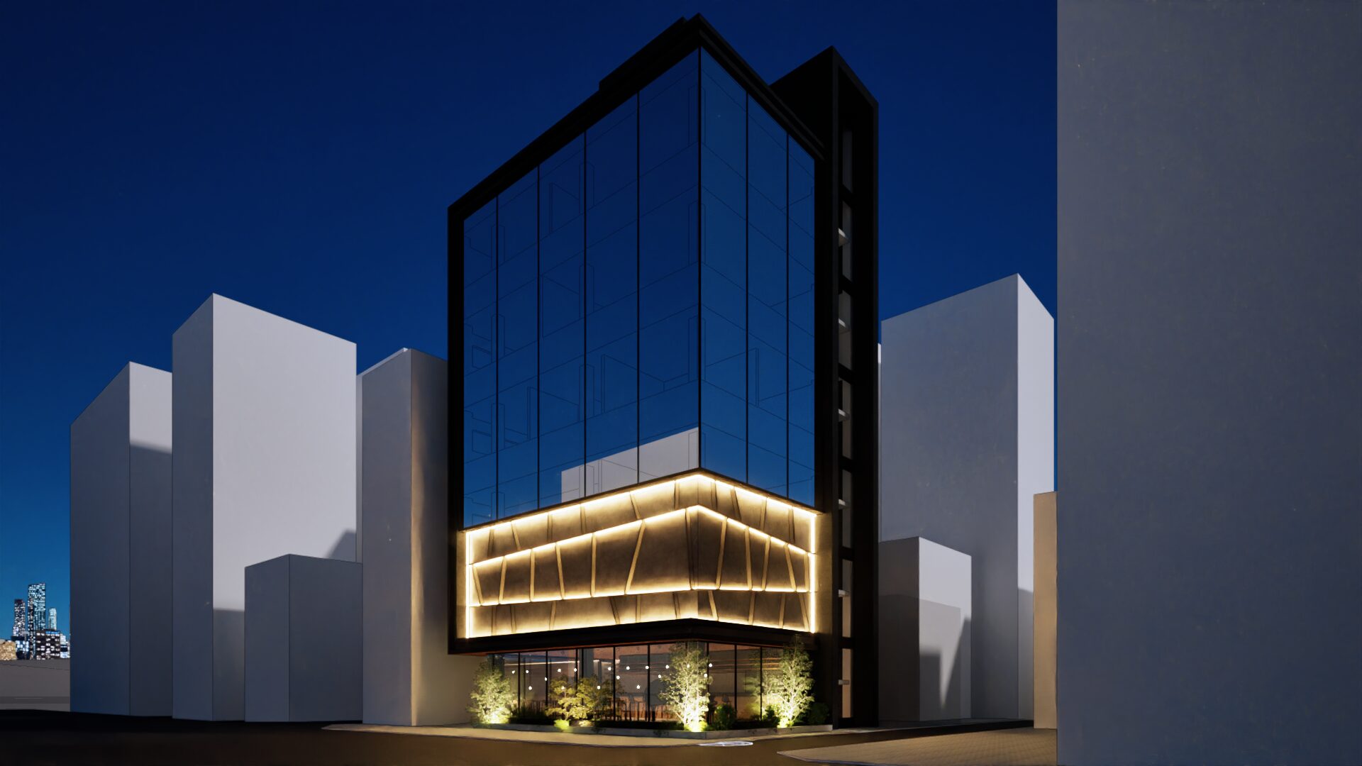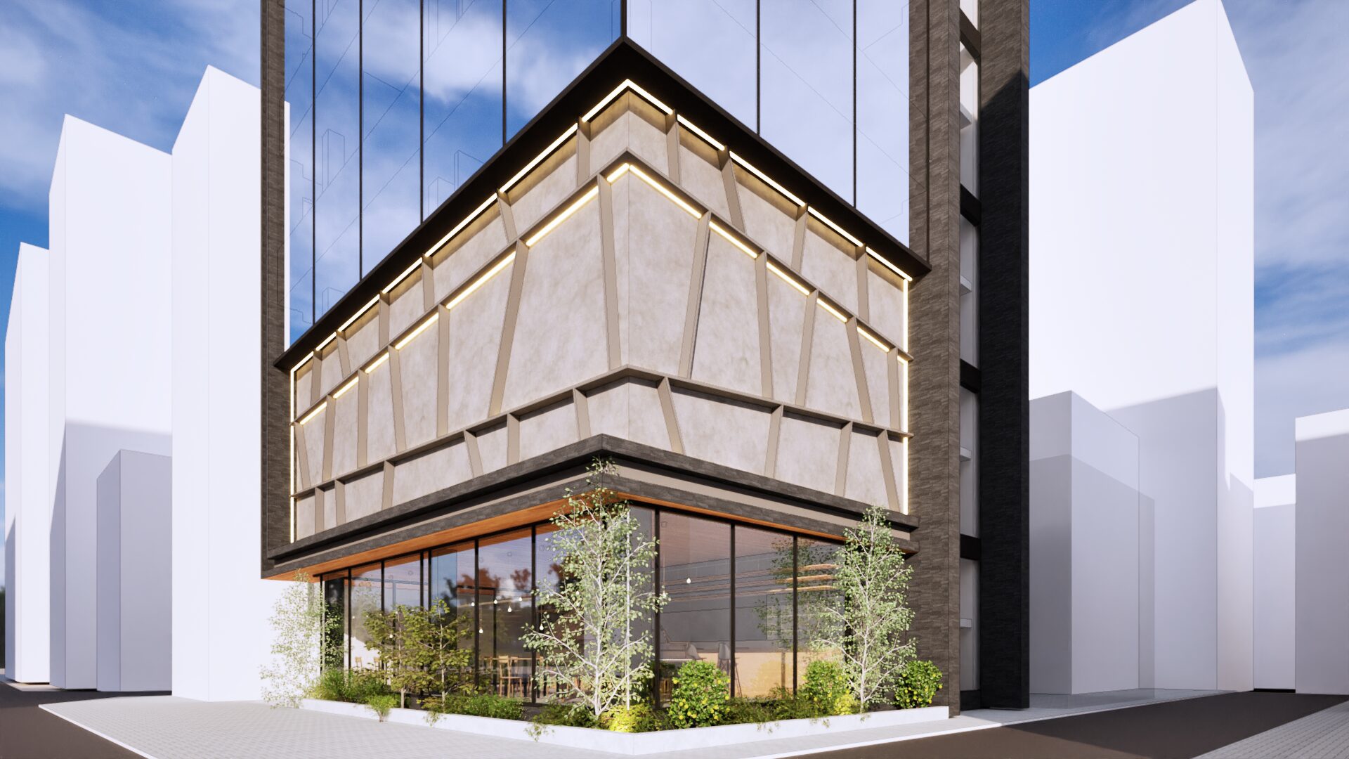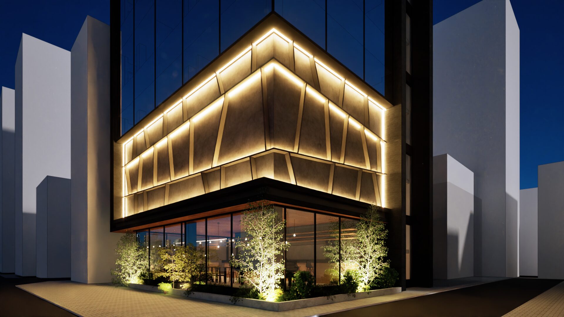 低層部には街に開かれたガラスファサードと植栽を設け、来訪者をやさしく迎え入れる空間を形成した。中層部の特徴的な外装とライン照明は、建物のアイコン性を高めるとともに、夜間景観においても存在感を放つ。