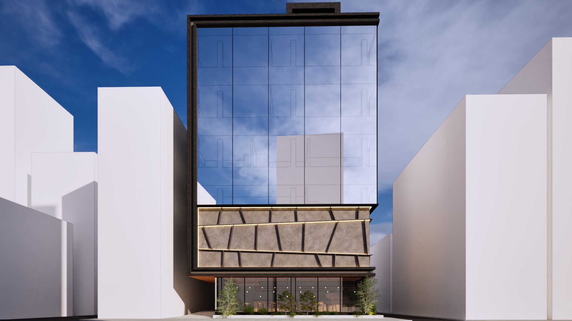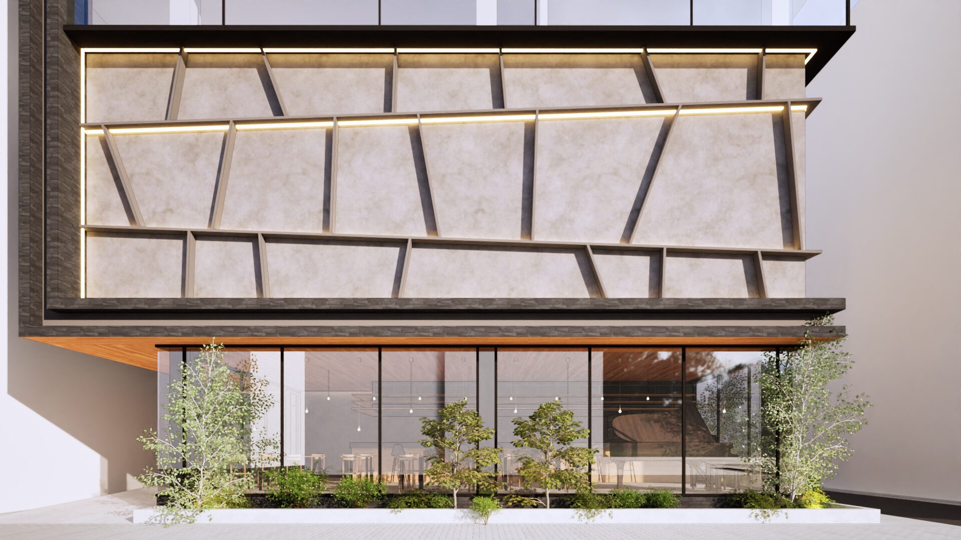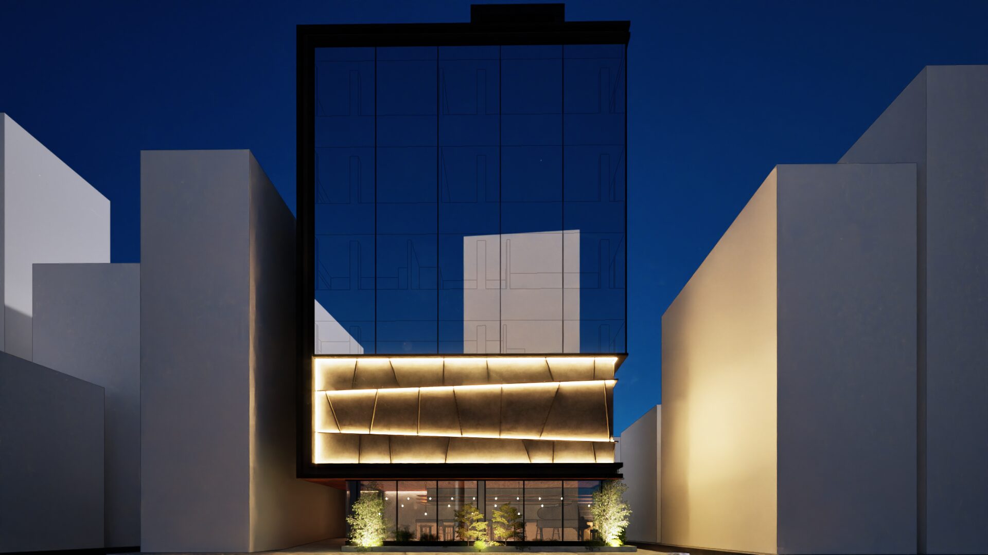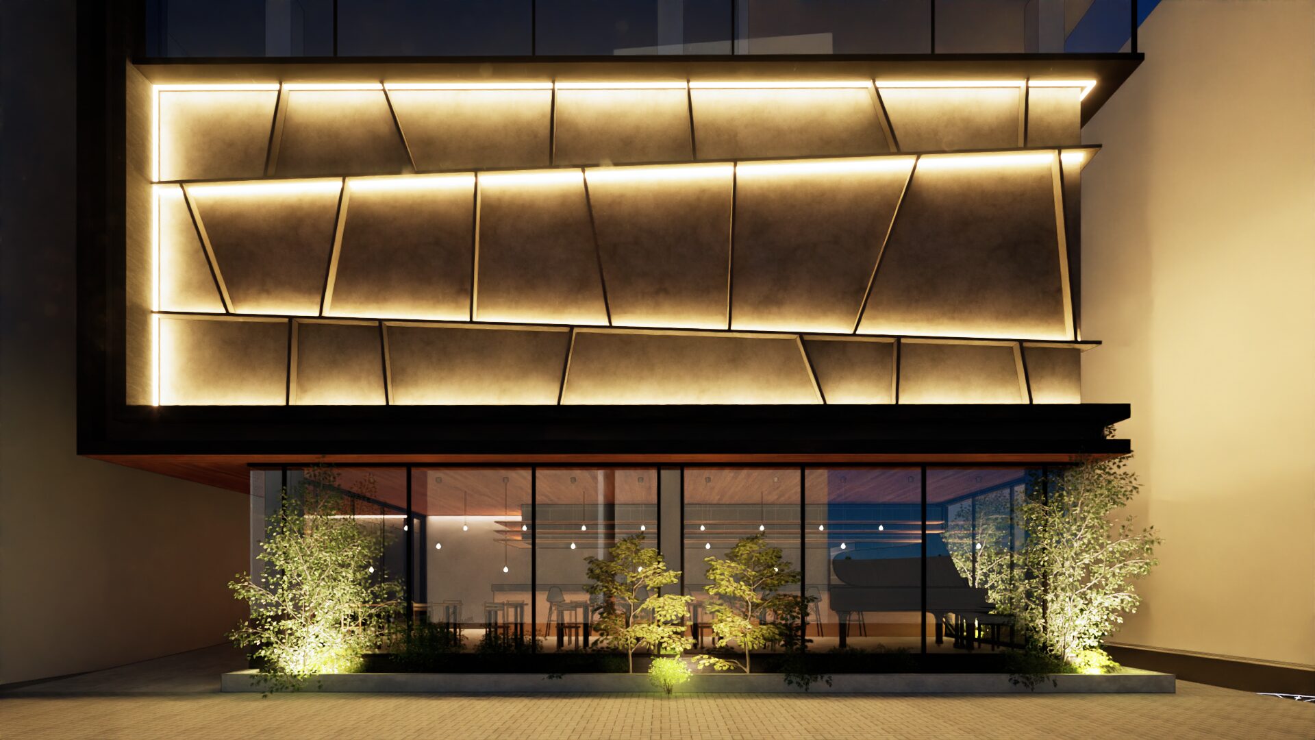 低層部には街に開かれたガラスファサードと植栽を設け、来訪者をやさしく迎え入れる空間を形成した。中層部の特徴的な外装とライン照明は、建物のアイコン性を高めるとともに、夜間景観においても存在感を放つ。