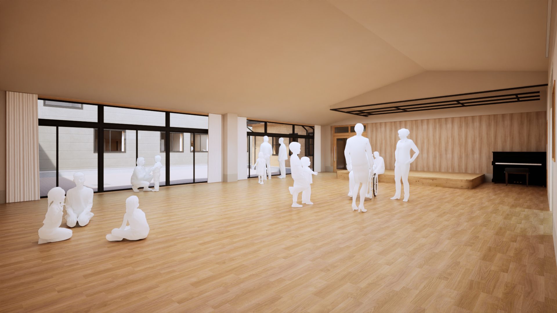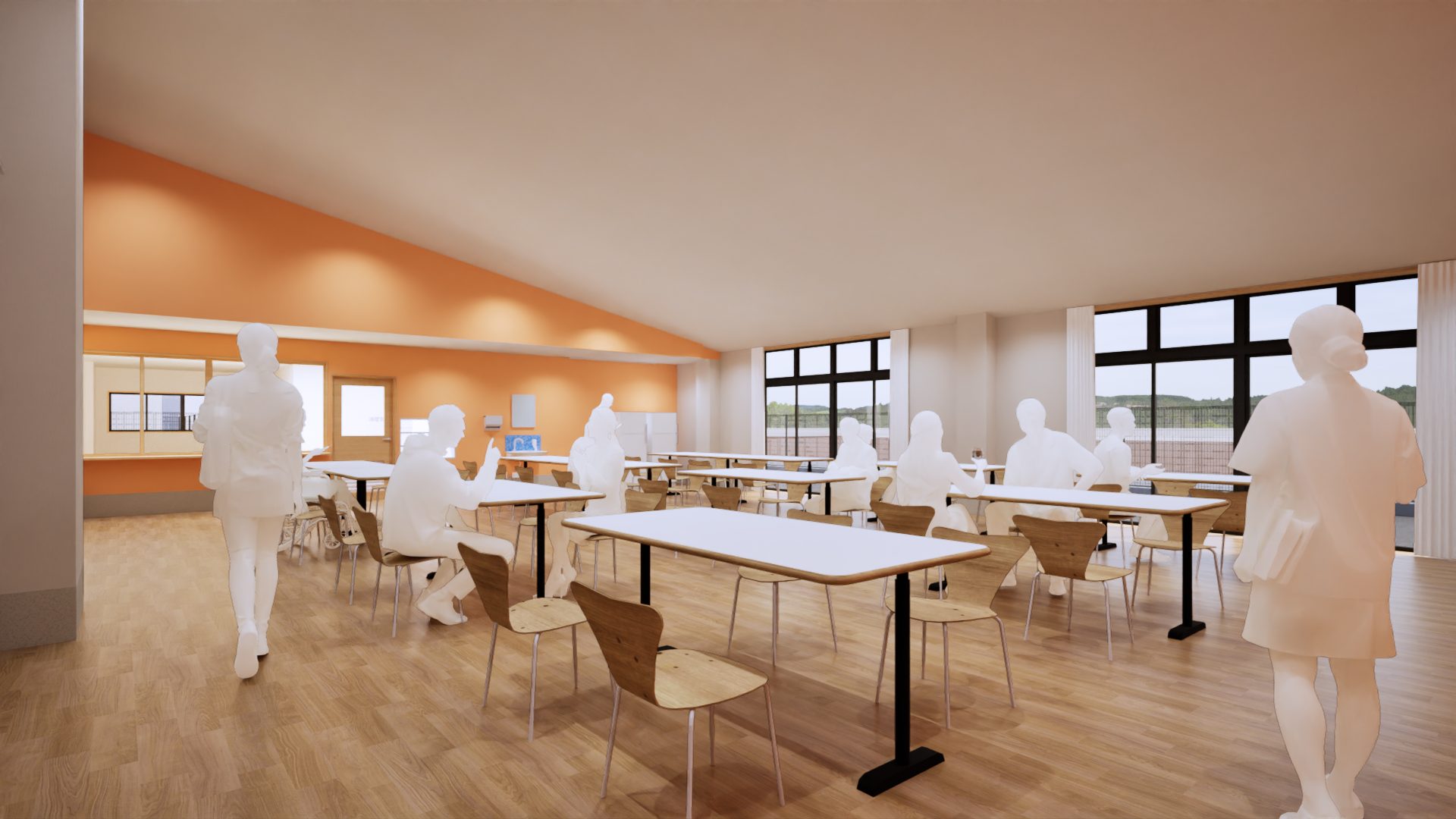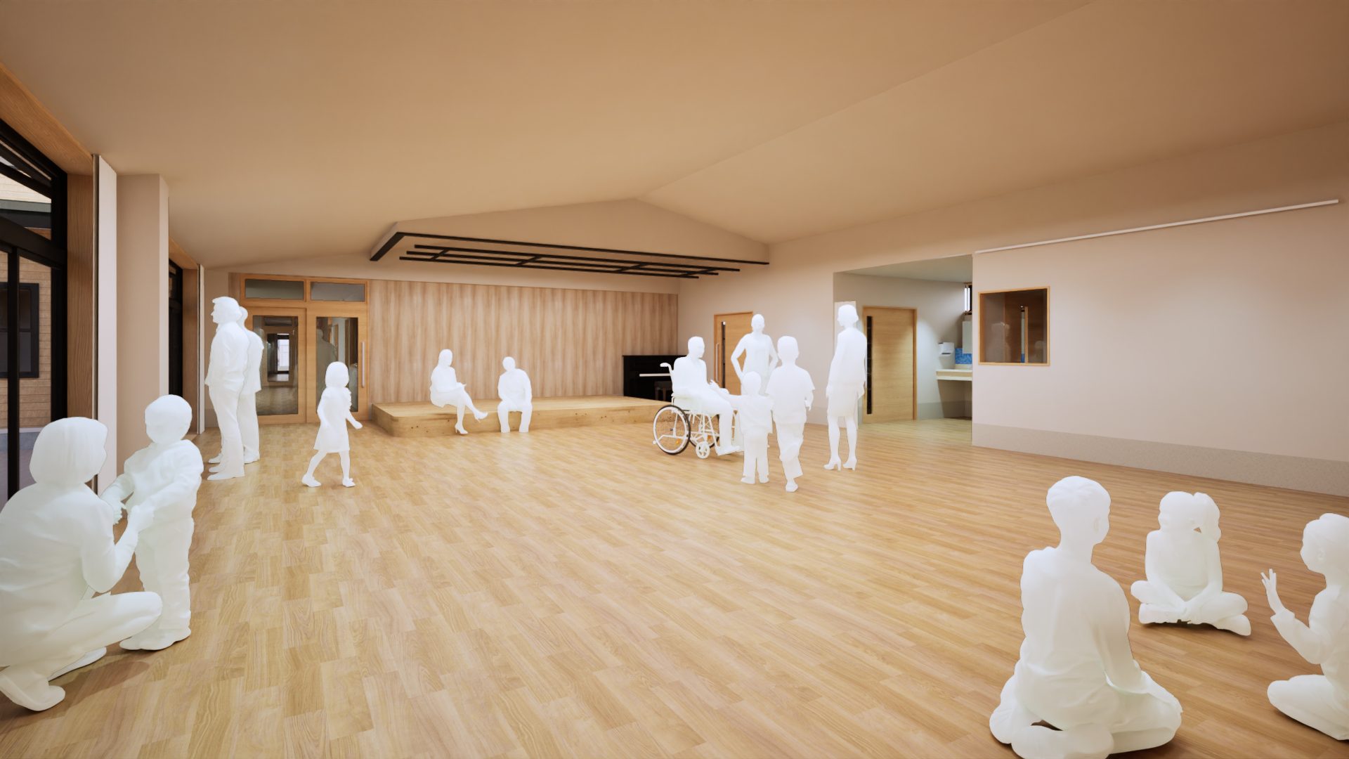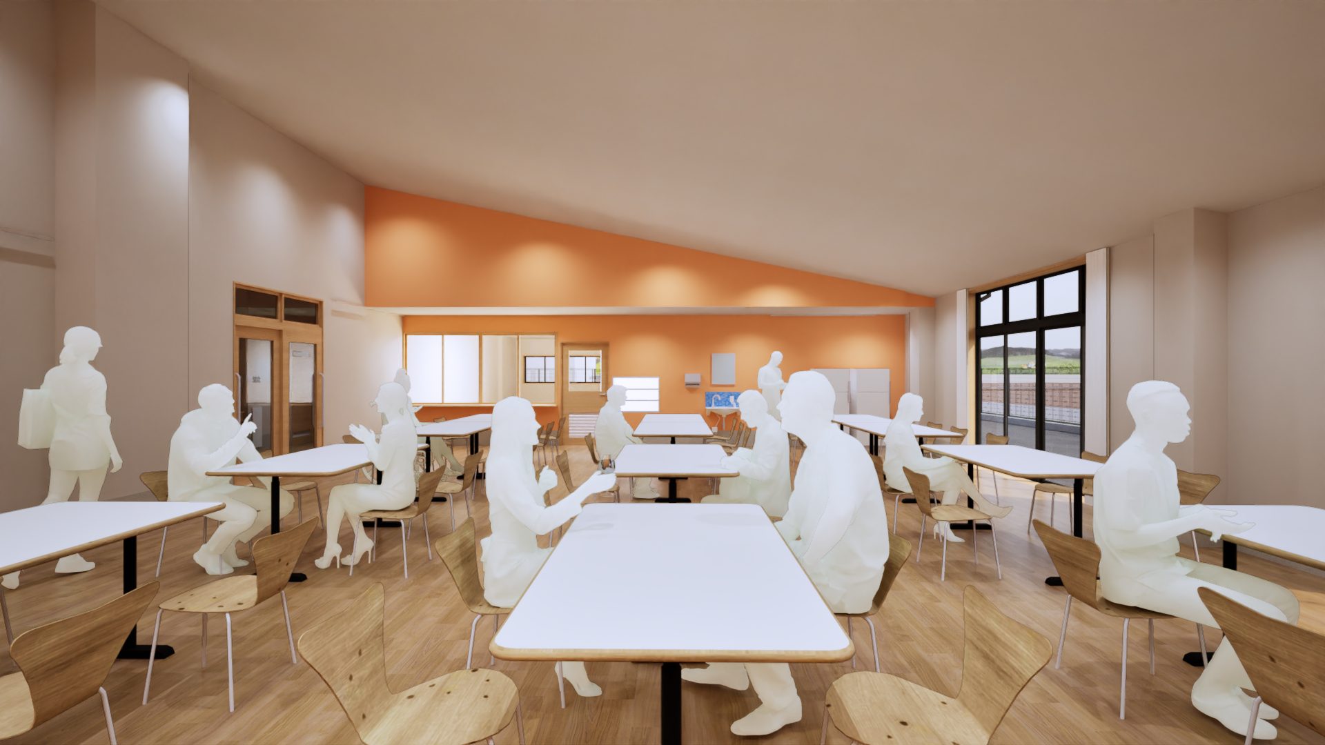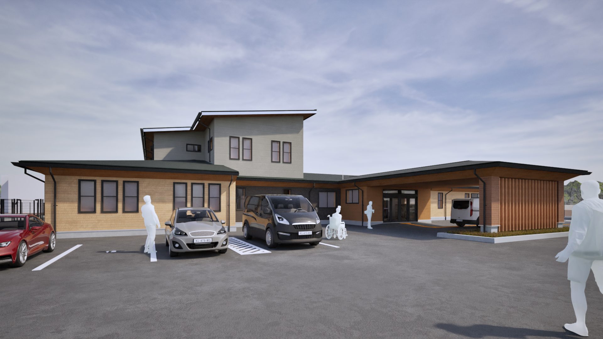 入所者が48名、ショートステイが4名の合計52名の方が利用される障がい者支援施設になります。広い敷地にゆったりとした寛容でおもむきのある建物としております。また、近隣の住宅に配慮した外観計画とし、地域に溶け込む建物として計画しております。