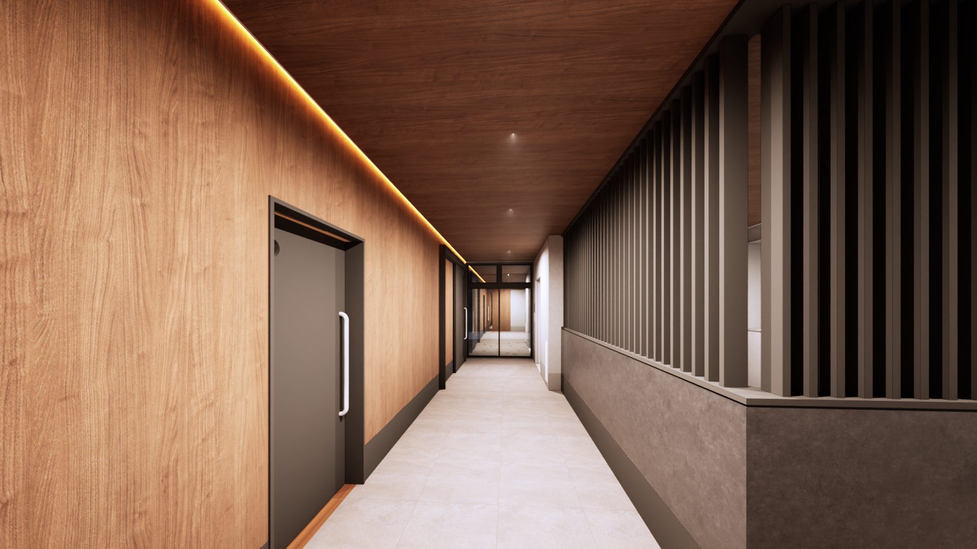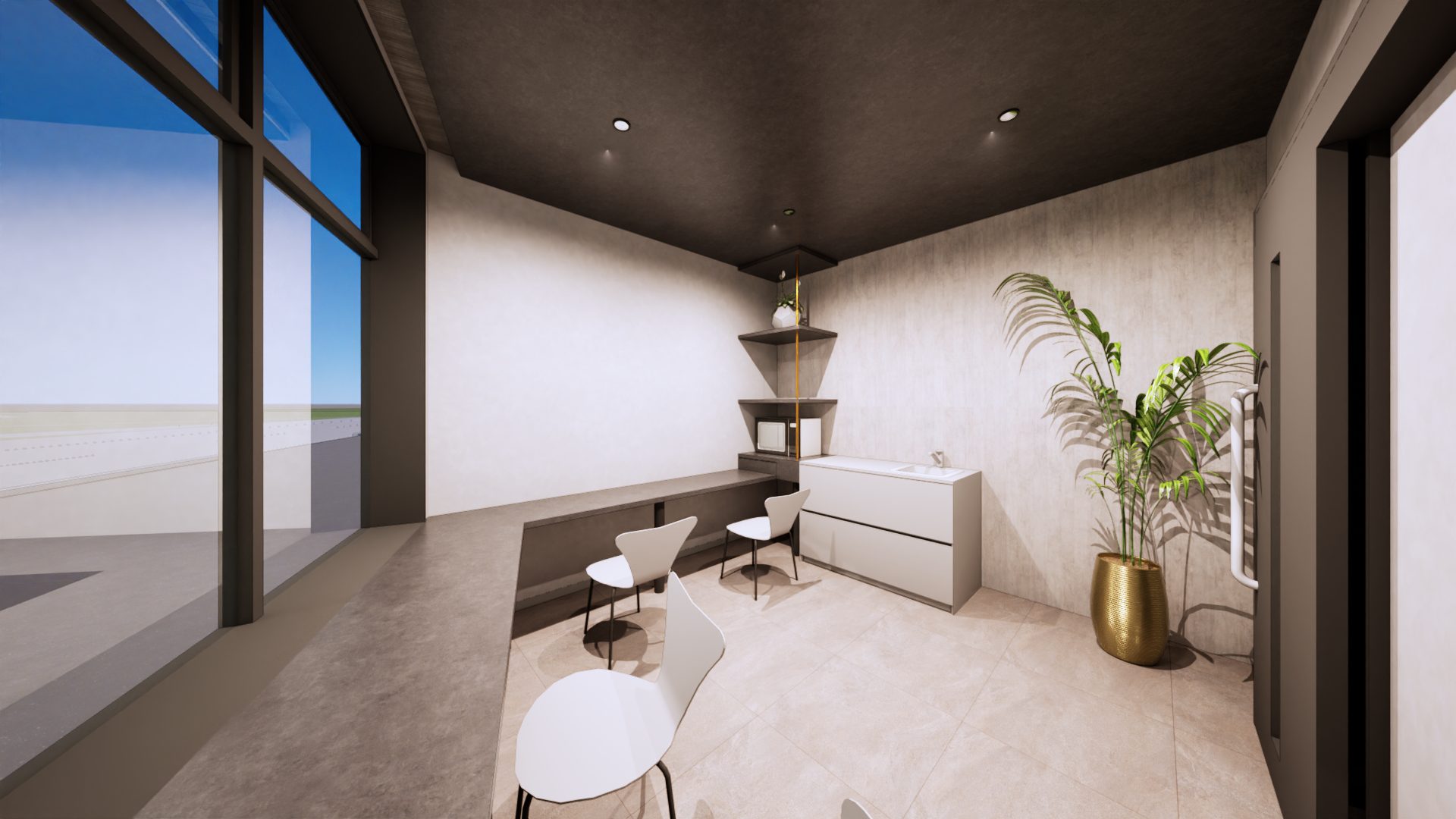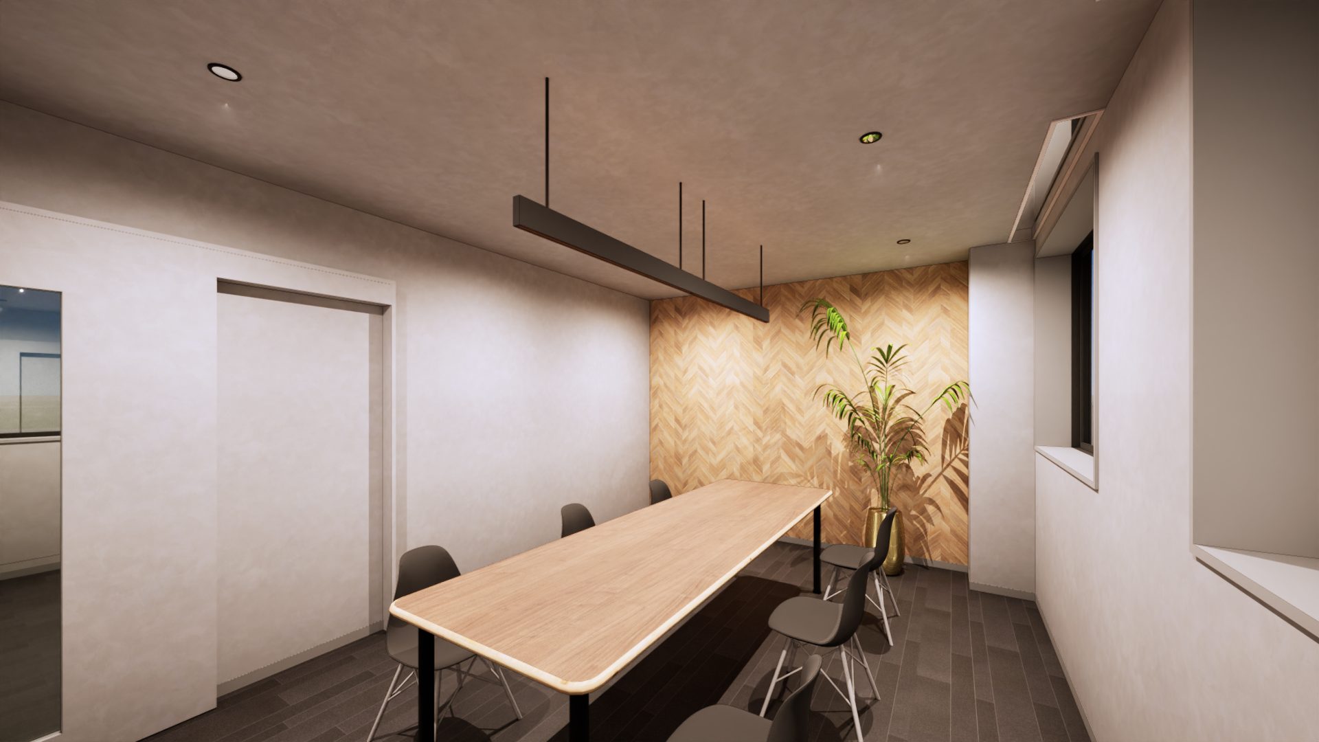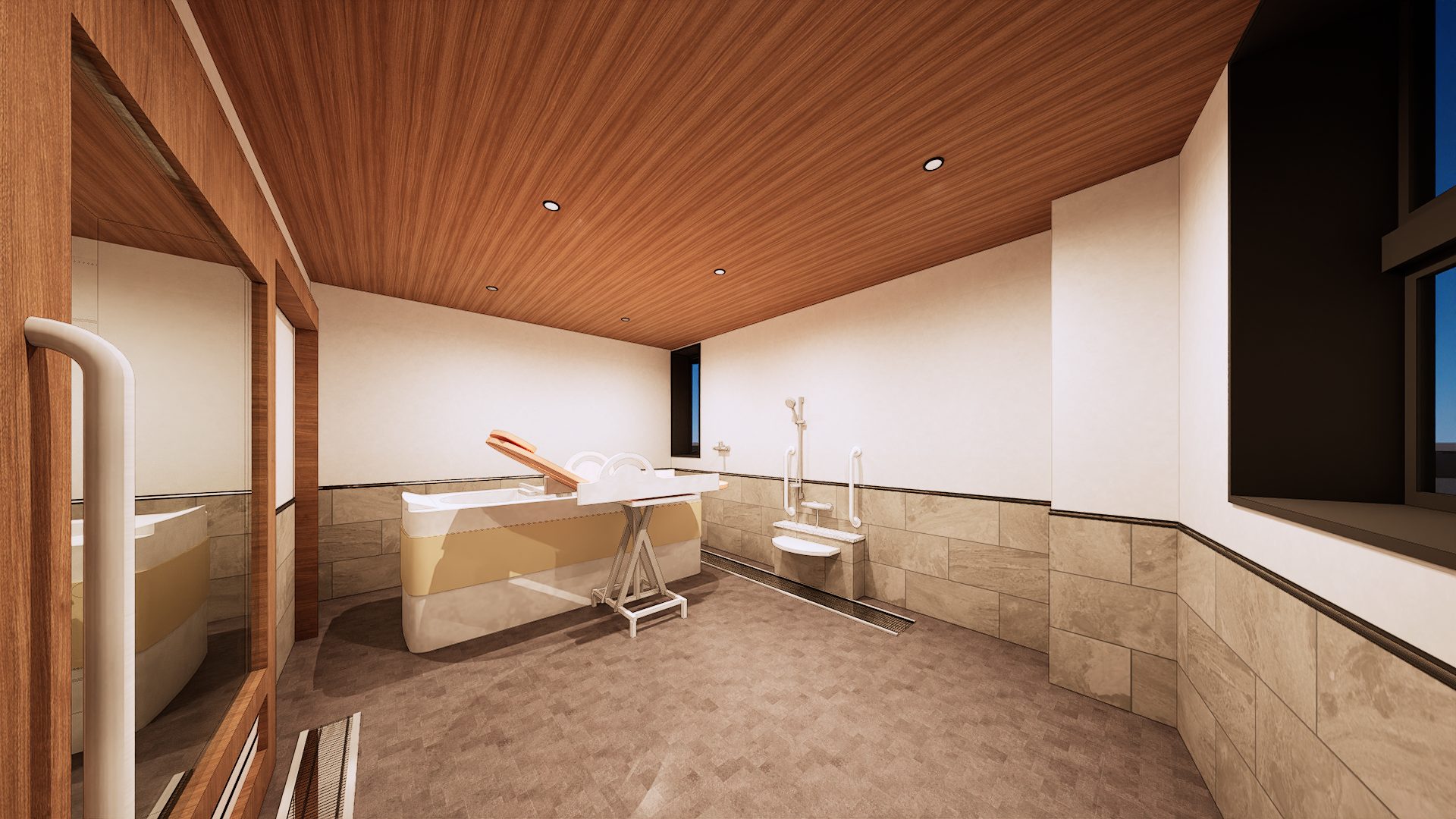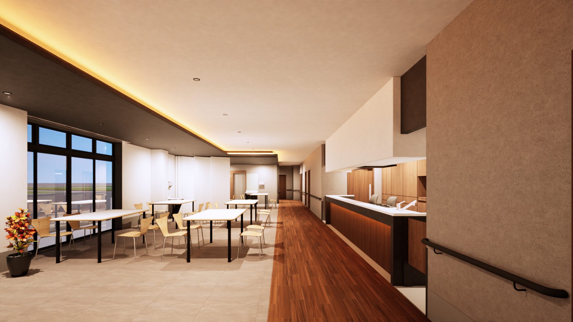 60名定員の障がい者向け通所施設の計画です。 建物の外観については周辺地域に対してシンボリックな建物となるようにデザインをしております。また、内部の空間については利用される方が日常と違うような特別な雰囲気を出しつつも落ち着いて過ごせるような空間を目指しました。