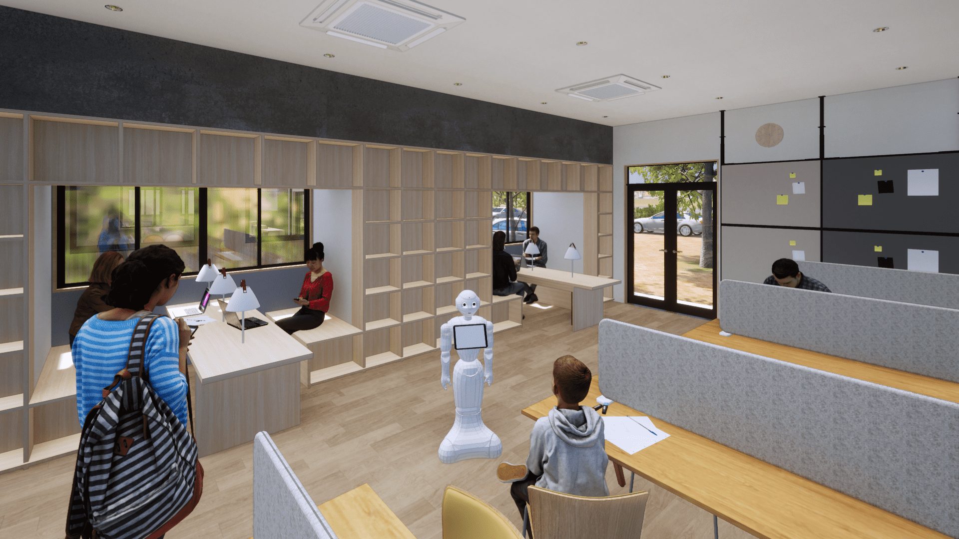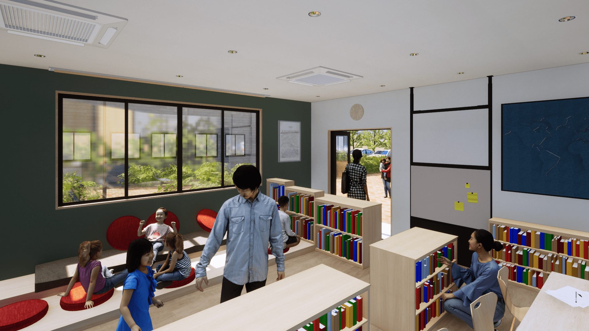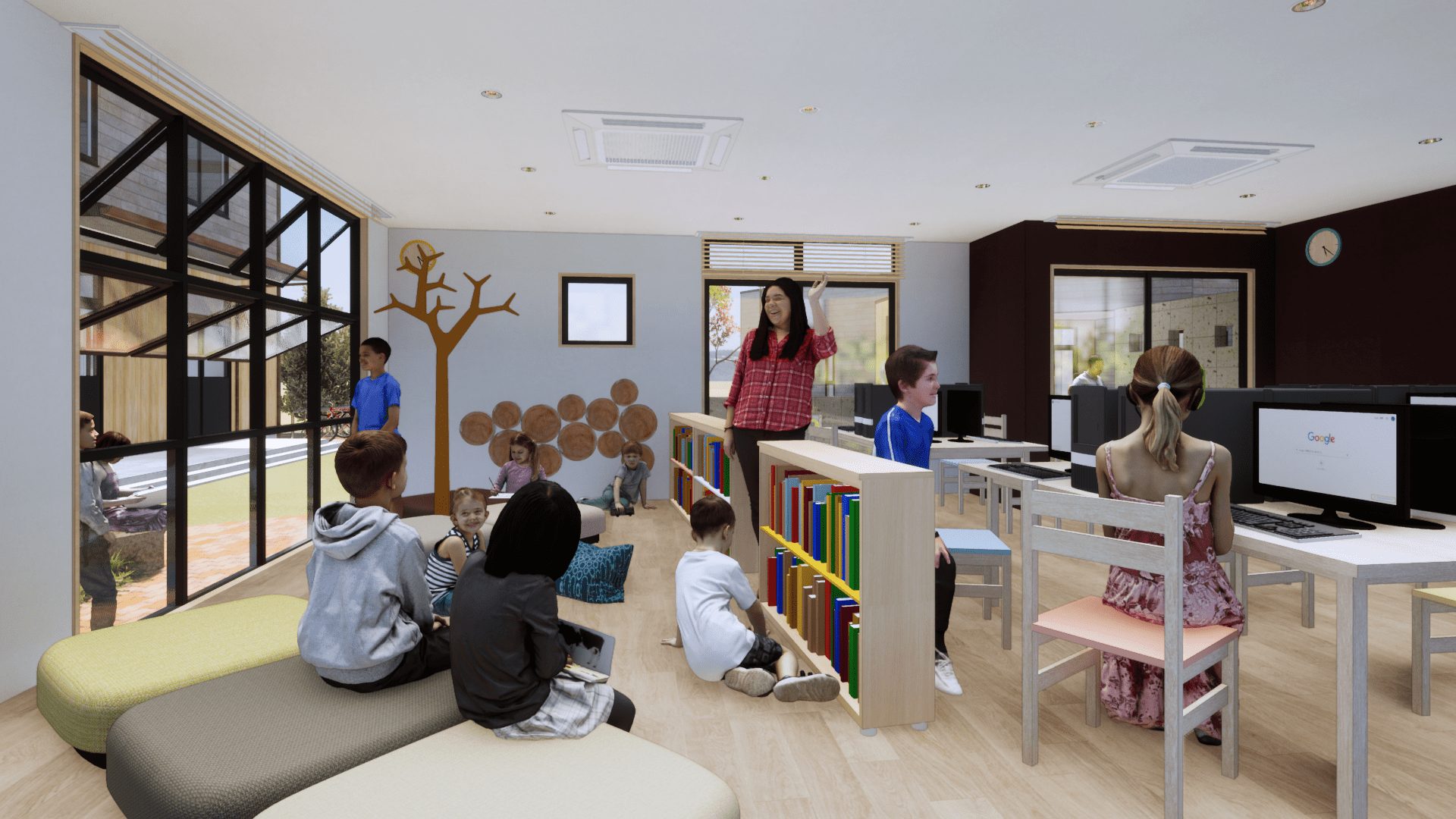 時代の要望に沿って、図書室やIТ学習室、野外音楽堂や中庭運動場等を整備して学び、