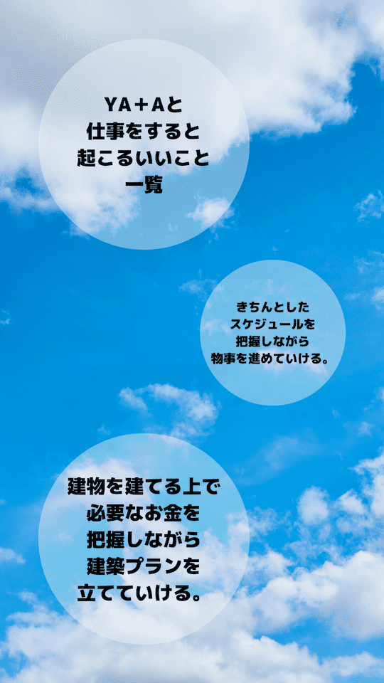 YA+Aは設計、デザインはもちろんですが、資金計画や入札管理等のお金の事、工事監理による建物クオリティに関する事、プロジェクト全体のスケジュール管理、それ以外にも土地の事など建築プロジェクトの最初から最後までお客様のサポートをさせていただいております。